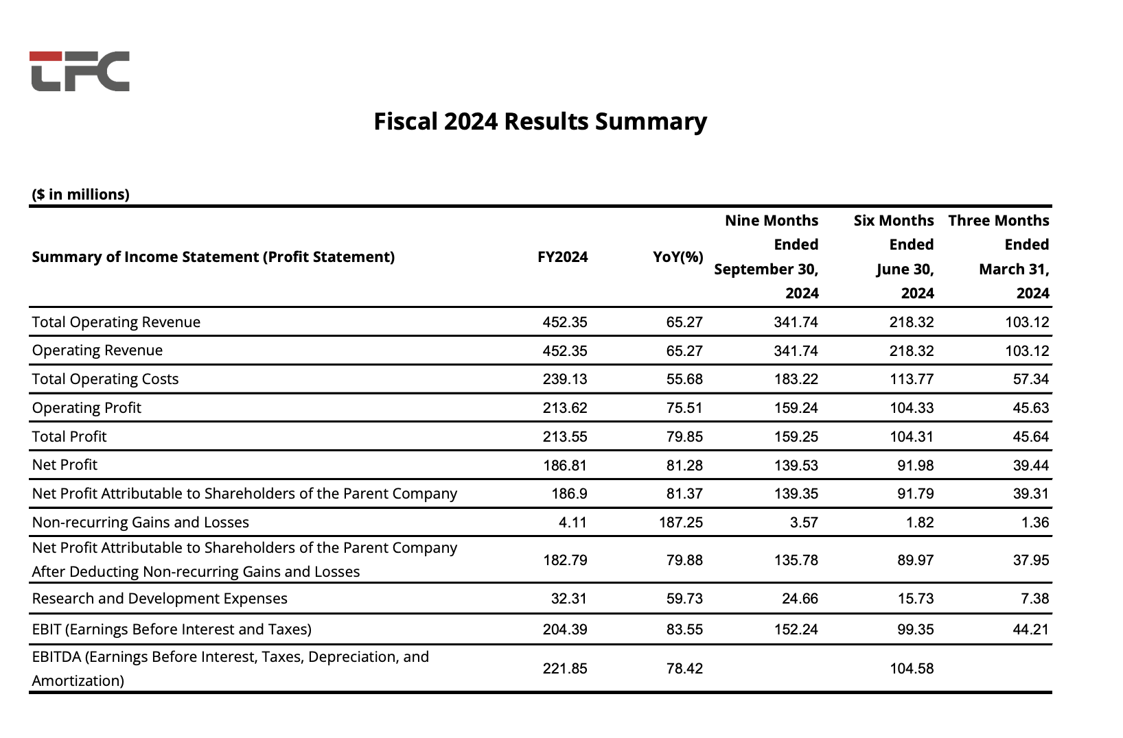 In 2024, TFC achieved a revenue of USD 452.35million, representing a 65.27% increase compared to the same period last year.