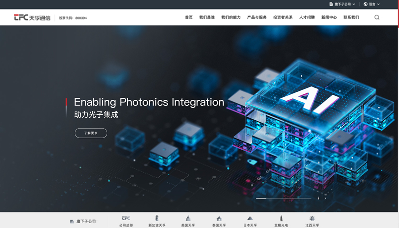 3月25日,歷經六個月的精心籌備與打磨,天孚通信官網全新改版上線!這不僅是網站的一次迭代升級,更是公司對外品牌形象的一次全方位重塑。新網站以全新的面貌、前沿的科技交互設計,以及豐富的內容和便捷的用戶體驗,為用戶展現了一個置身于AI科技時代的天孚通信。
